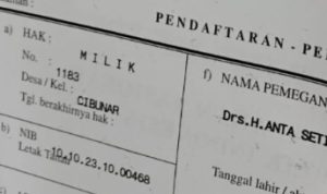 Berdasarkan informasi yang dihimpun, tanah yang disengketakan selama ini diketahui dikelola sebagai Aset Desa. Namun belakangan diketahui, mantan Kepala Desa tersebut diduga mengalihkan lahan tersebut kepada seseorang bernama Drs. H. Anta Setiana, MM, sehingga memicu pertanyaan terkait status hukum dan keabsahan dokumen kepemilikan.